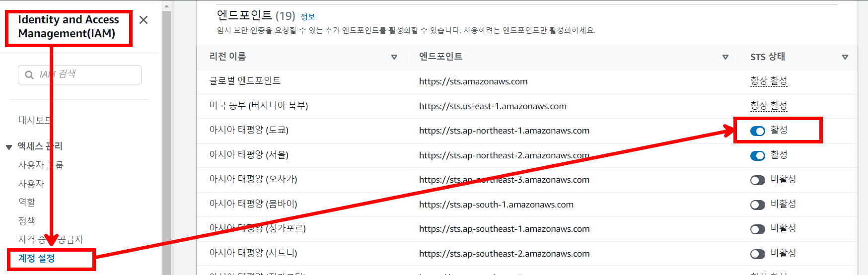 워크스페이스에 연결하기 전에 IAM 계정 설정에서 STS 엔드포인트 설정으로 해당 리전을 활성화해주어야 합니다.