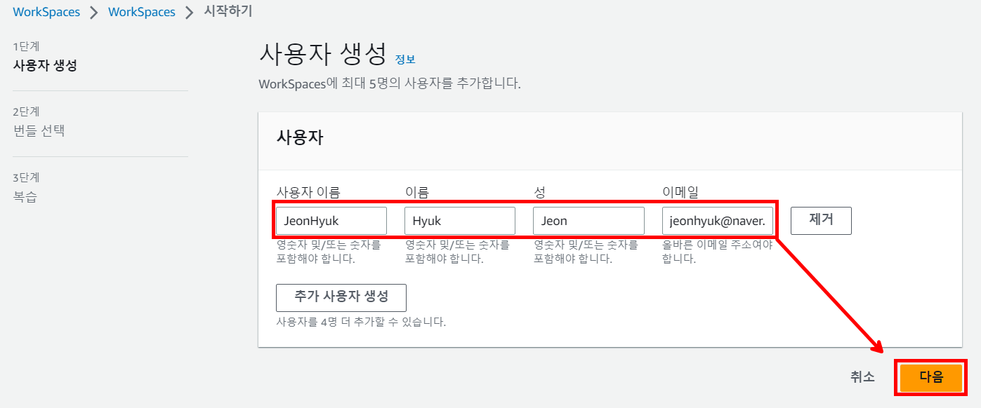 WorkSpaces에 최대 5명의 사용자를 추가할 수 있습니다. 사용자를 생성합니다.