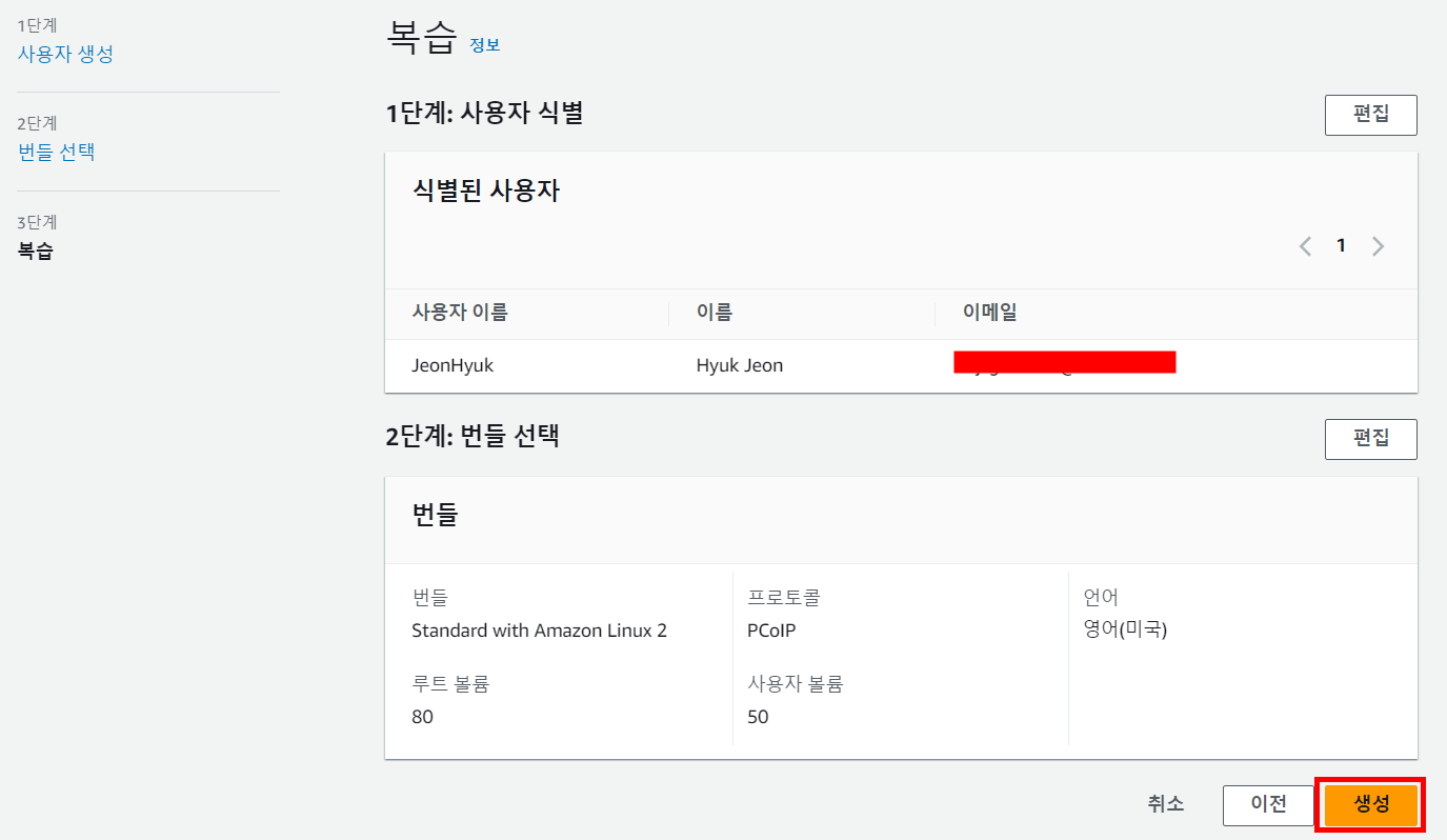 다음과 같이 설정한 내용을 다시 확인한 후 [생성]을 선택합니다.