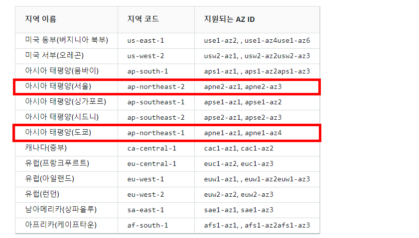(리전 버지니아 북부, 오레곤, 아일랜드, 싱가포르, 시드니, 도쿄)