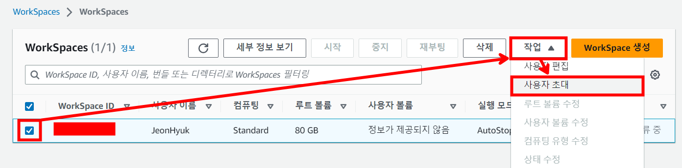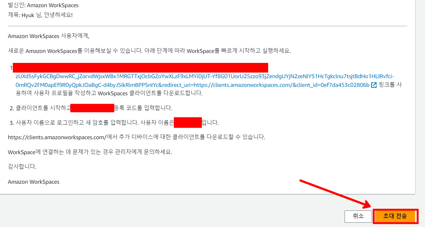 다음과 같이 사용자 초대를 보낼 수 있고 초대를 받은 사용자가 메일을 통해 설정하면 WorkSpaces에 들어올 수 있게 됩니다.