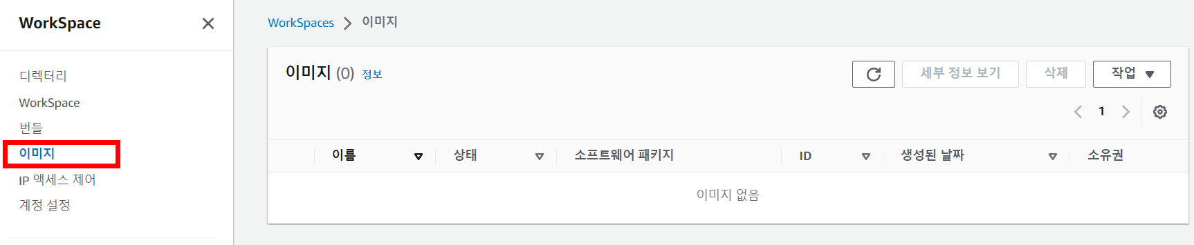 WorkSpace의 세부 정보에서는 발생하는 에러 메세지 확인, 이미지 생성, 스냅샷 생성 등 다양한 기능을 제공합니다.
