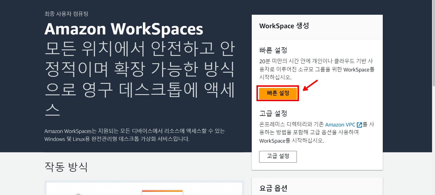 AWS WorkSpace 서비스를 선택한 후 [빠른 설정]을 눌러줍니다.