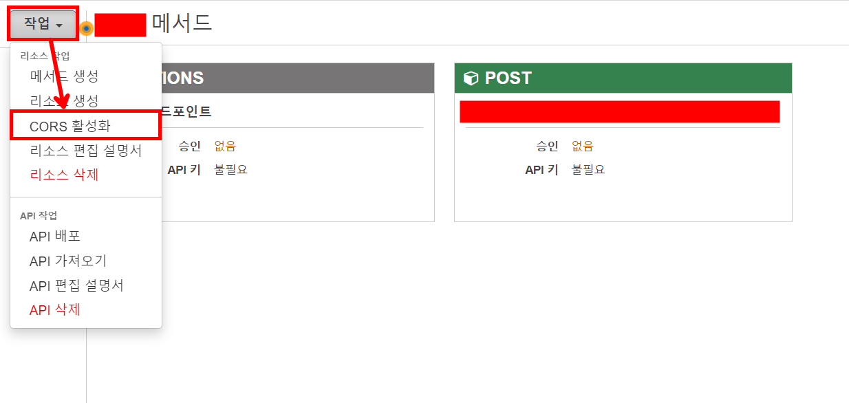 REST API에서 리소스 및 메서드를 생성합니다. CORS를 활성화 합니다.