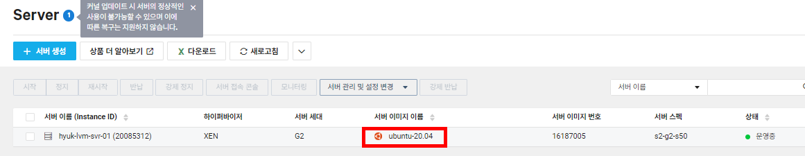 LVM 테스트를 위해 네이버 클라우드 플랫폼에 ubuntu-20.04를 띄운 후 테스트를 진행하였습니다.