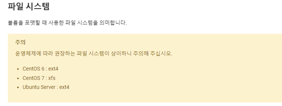 네이버 클라우드 플랫폼 가이드에는 다음과 같이 권장하는 파일 시스템을 안내하고 있습니다. 해당 운영체제에 맞는 파일시스템을 구축하기 위해 파일 시스템 포맷을 해야 합니다.