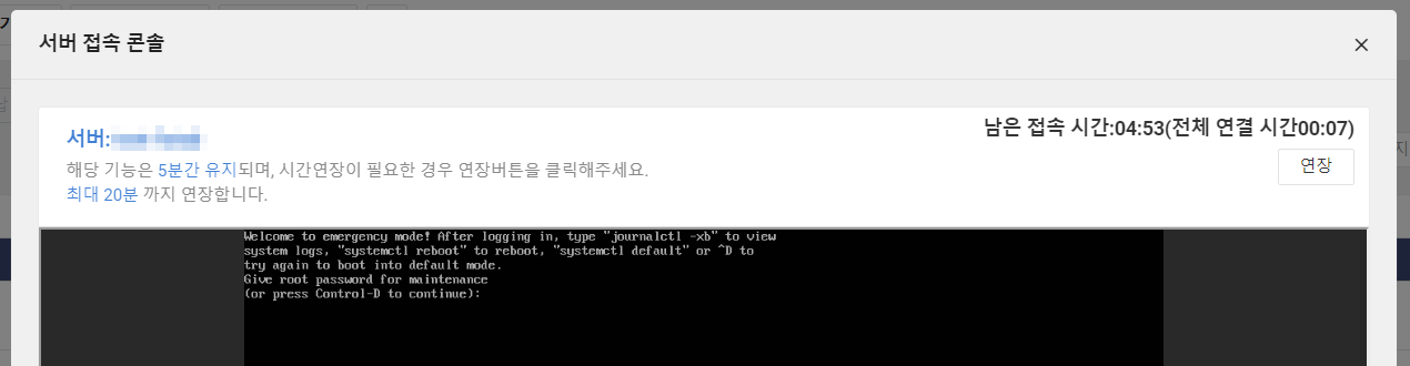 fstab의 설정이 잘못되었다면 부팅에 실패하고 Emergency Mode에 진입하게 됩니다. 다음 서버 접속 콘솔을 통해 fstab을 다시 설정한 후 재부팅하면 해결할 수 있습니다.