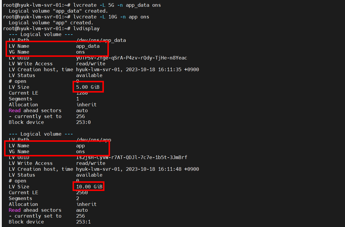 # lvcreate -L (L:사이즈 지정) -n (n:lv 이름 지정) <lv name> <vg name>