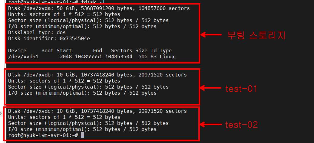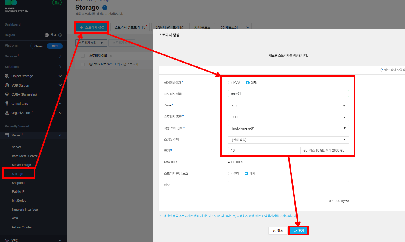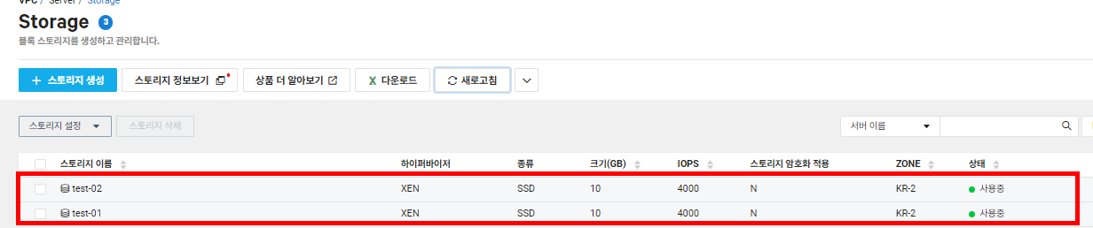 다음과 같이 부팅 스토리지를 제외한 추가 스토리지(test-01, test-02)를 최소 용량으로 2개를 생성해줍니다.