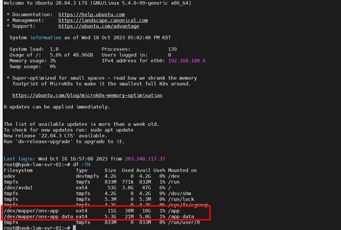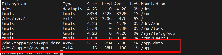 파일 시스템은 ext4, 마운트 포인트는 지정한 /app_data, /app으로 마운트된 것을 확인할 수 있습니다. 재부팅 시 Mount가 풀릴 수 있기 때문에 재부팅 후에도 부팅 시 마운트하기 위해서는 fstab 설정을 해야 합니다.