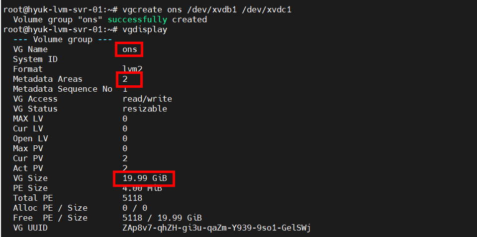 VG 이름은 ons로 설정되고 xvdb1, xvdc1 PV를 VG로 만들어서 VG Size가 20GB인 것을 확인할 수 있습니다.