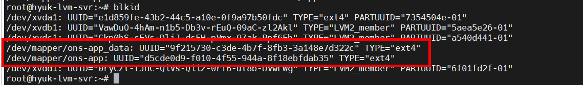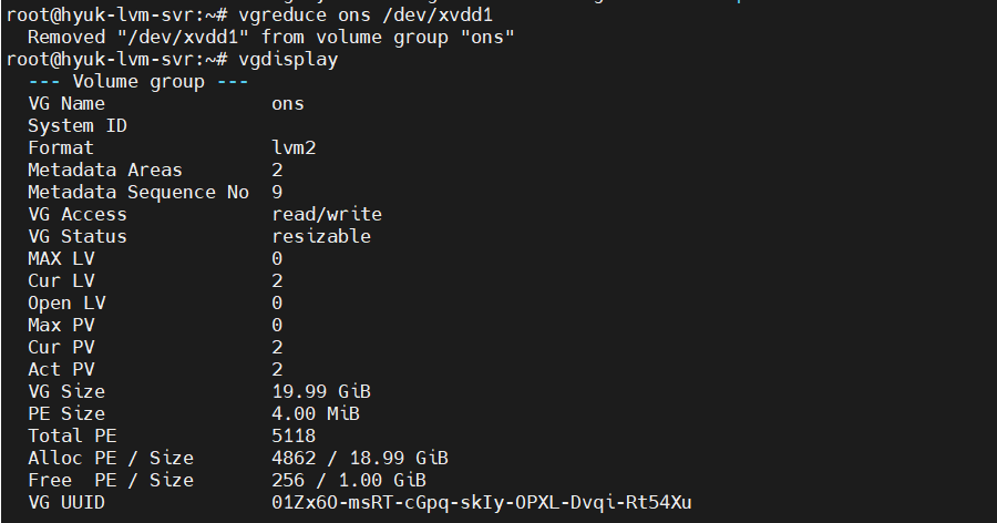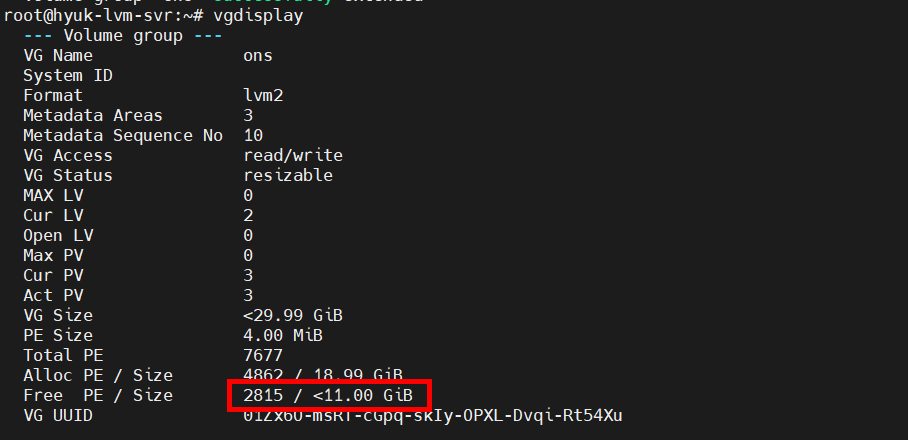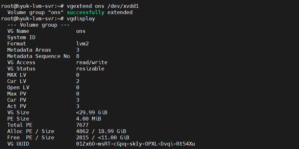 다음과 같이 vgextend를 통해 PV를 기존 VG인 ons에 추가한 모습입니다.