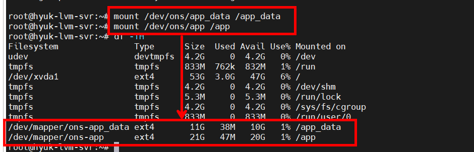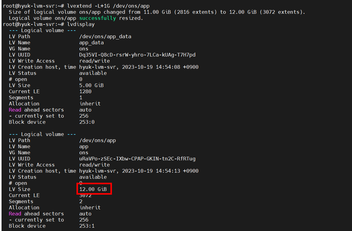 /dev/ons/app이 기존 11GB에서 12GB로 1GB만큼 사이즈가 커진 것을 확인할 수 있습니다.