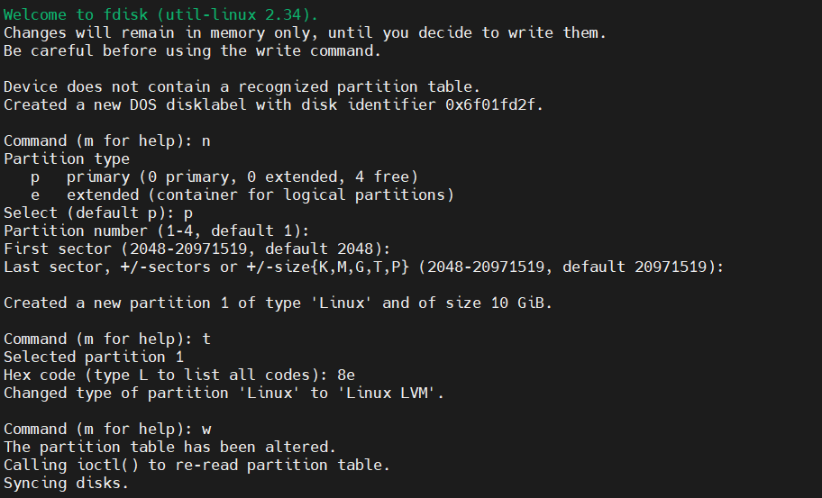 다음과 같이 새로 추가된 스토리지에 대해 파티션을 생성하고 LVM으로 설정해 줍니다.