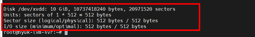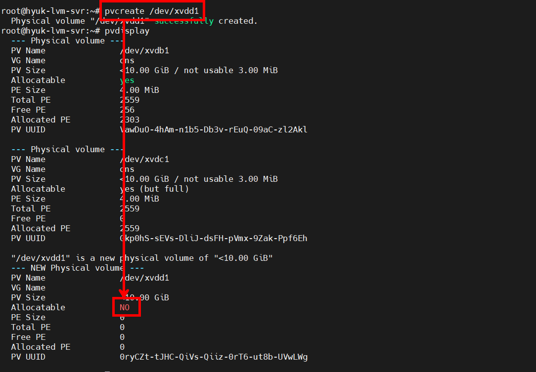 처음 LVM을 설정하는 것처럼 PV를 생성하는 것까진 동일한 프로세스입니다. 다음과 같이 추가 스토리지에 대해 PV를 생성합니다.