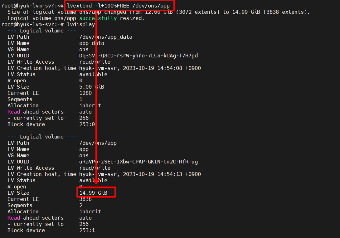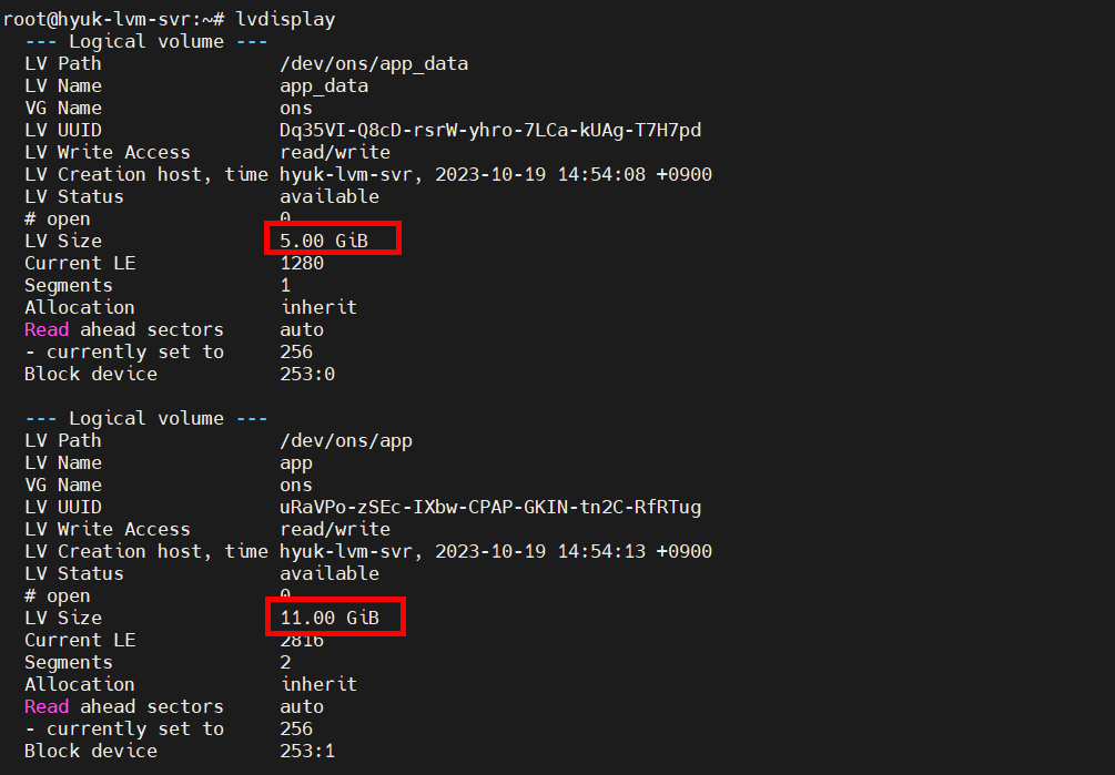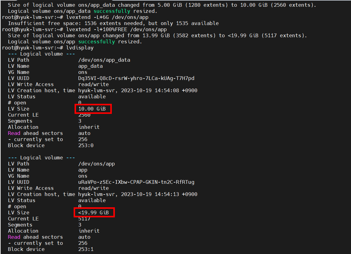기존 LV(app_data, app)에 각각 5G와 남은 용량을 모두 할당한 후 확인하면 다음과 같이 10GB, 20GB의 용량으로 증설된 것을 확인할 수 있습니다.