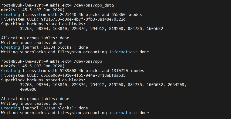 테스트에 사용된 서버의 운영체제가 ubuntu20.04이기 때문에 파일 시스템은 ext4로 포맷합니다.