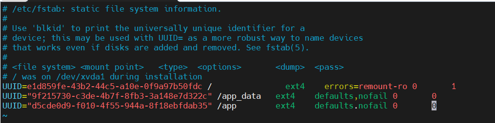 재부팅 후 마운트가 풀리는 것을 방지하기 위해 fstab을 설정하여 부팅 시 자동으로 마운트 되게 끔 설정하겠습니다. 다음과 같이 설정하면 되는데 오탈자가 생길 경우 부팅 시 문제가 생길 수 있기 때문에 nofail 옵션을 걸어주어 오류 발생 시 해당 디스크를 제외한 후 부팅이 되게 끔 수정합니다.