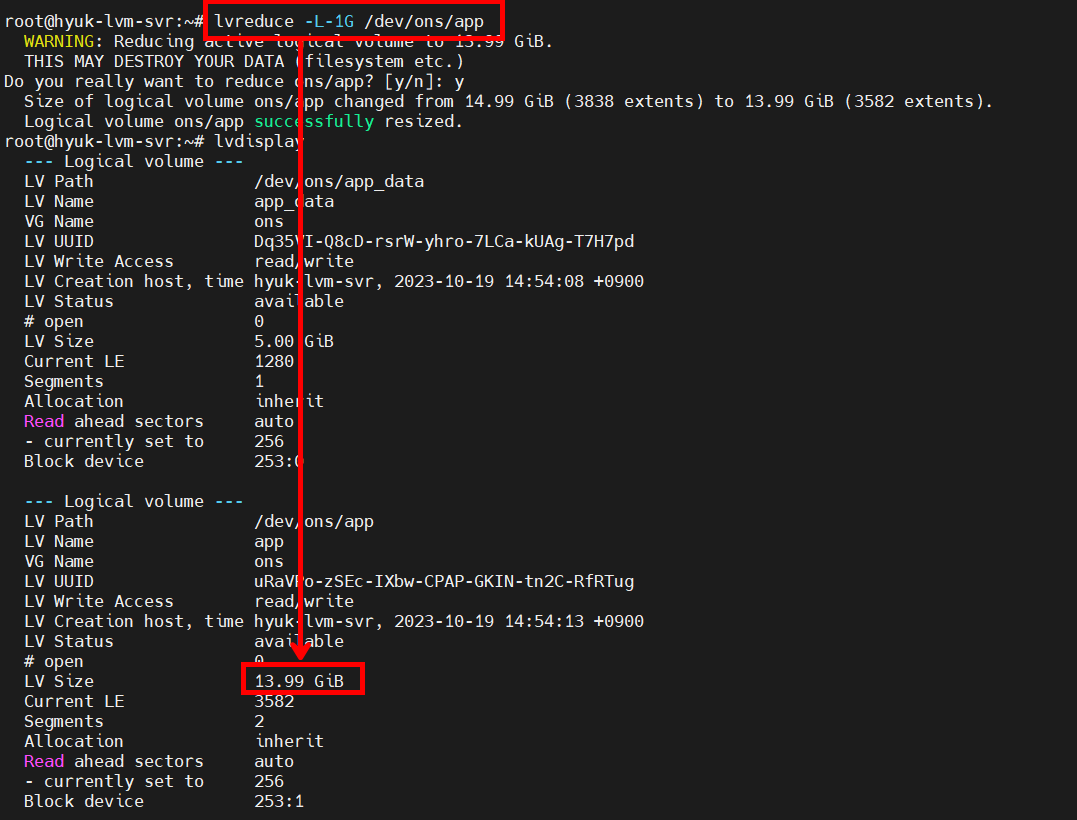 다음과 같이 LV 볼륨을 축소하는 것도 가능합니다. 축소할 때 주의사항은 데이터가 소실될 수 있습니다.