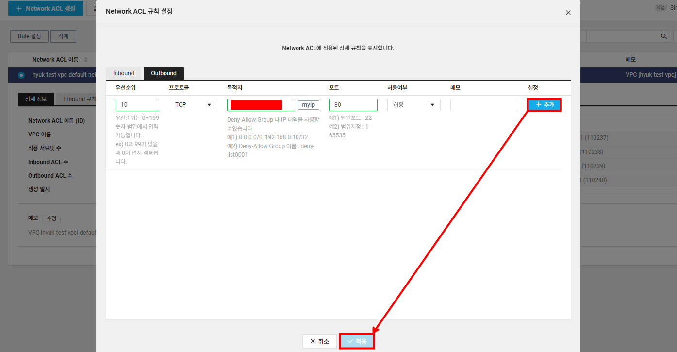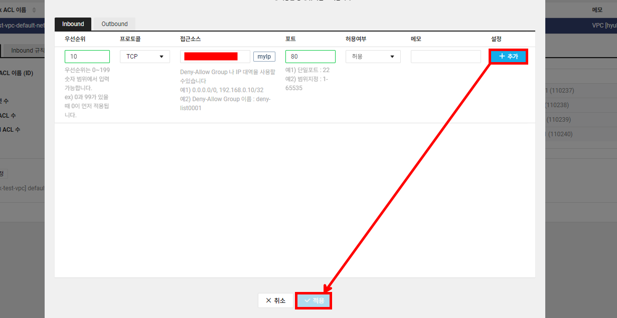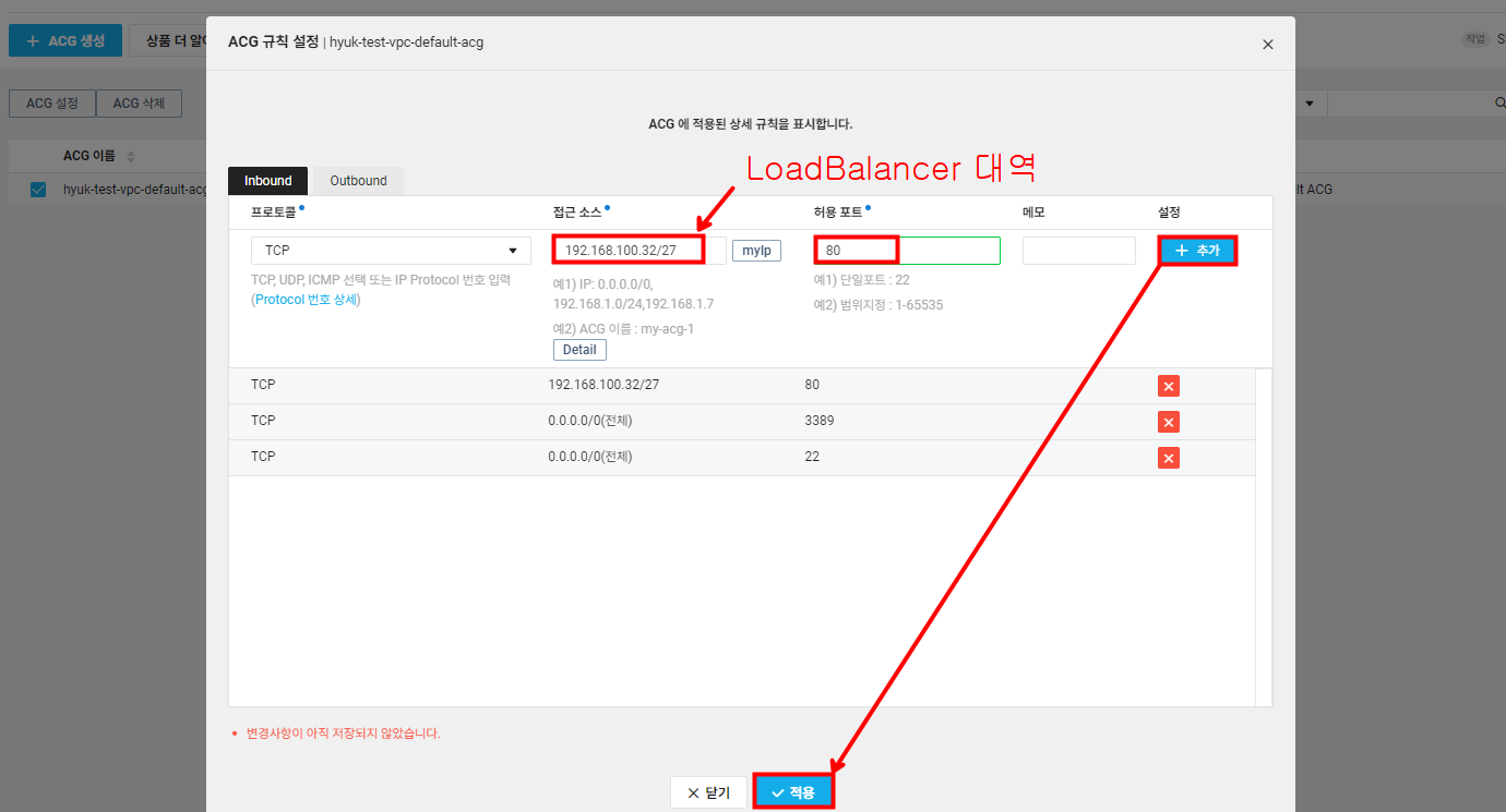인스턴스 레벨에서는 HTTP 포트를 허용해 주었지만 서브넷 레벨에서 엔드 유저의 요청을 받기 위해 NACL을 통해 HTTP 포트를 허용해주어야 합니다. 로드 밸런서를 테스트하는 용도이기 때문에 인바운드/아웃바운드를 내 IP로 설정합니다.