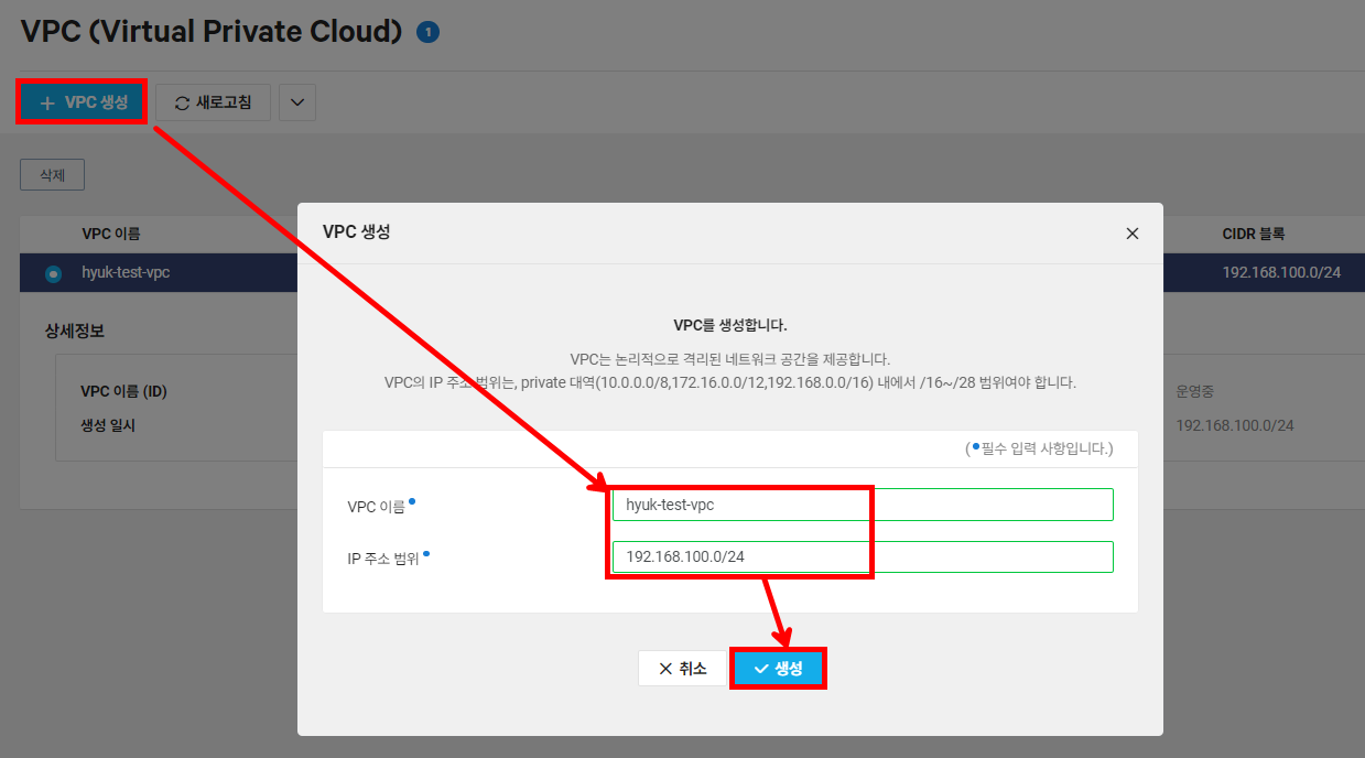 | hyuk-pri-sub-01 | 192.168.100.64/27 | Private | 일반 |