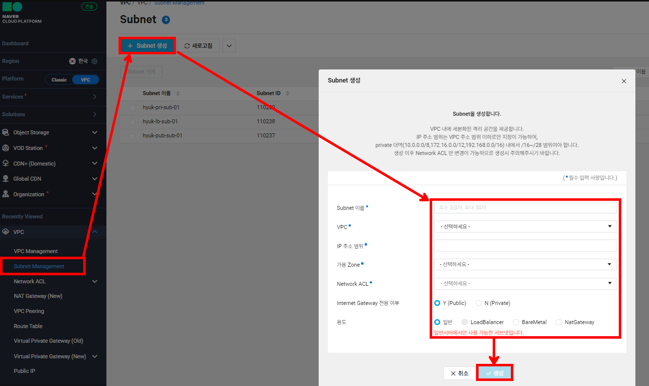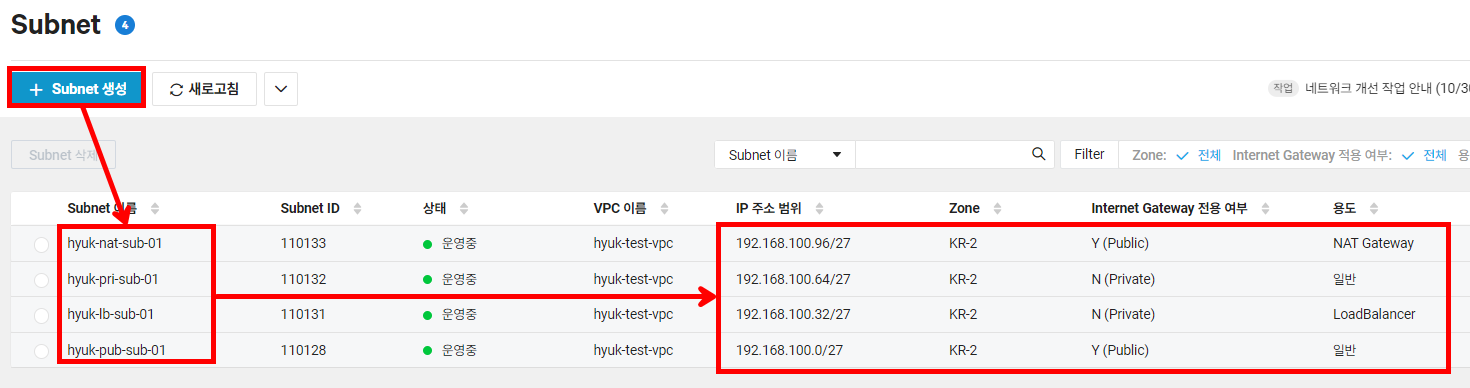| hyuk-pub-sub-01 | 192.168.100.0/27 | Public | 일반 |