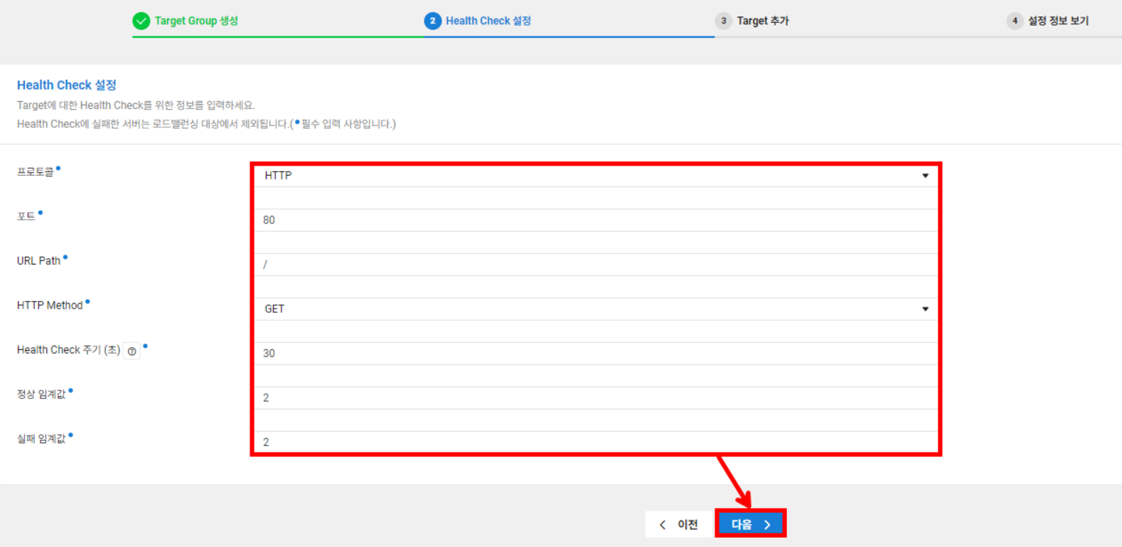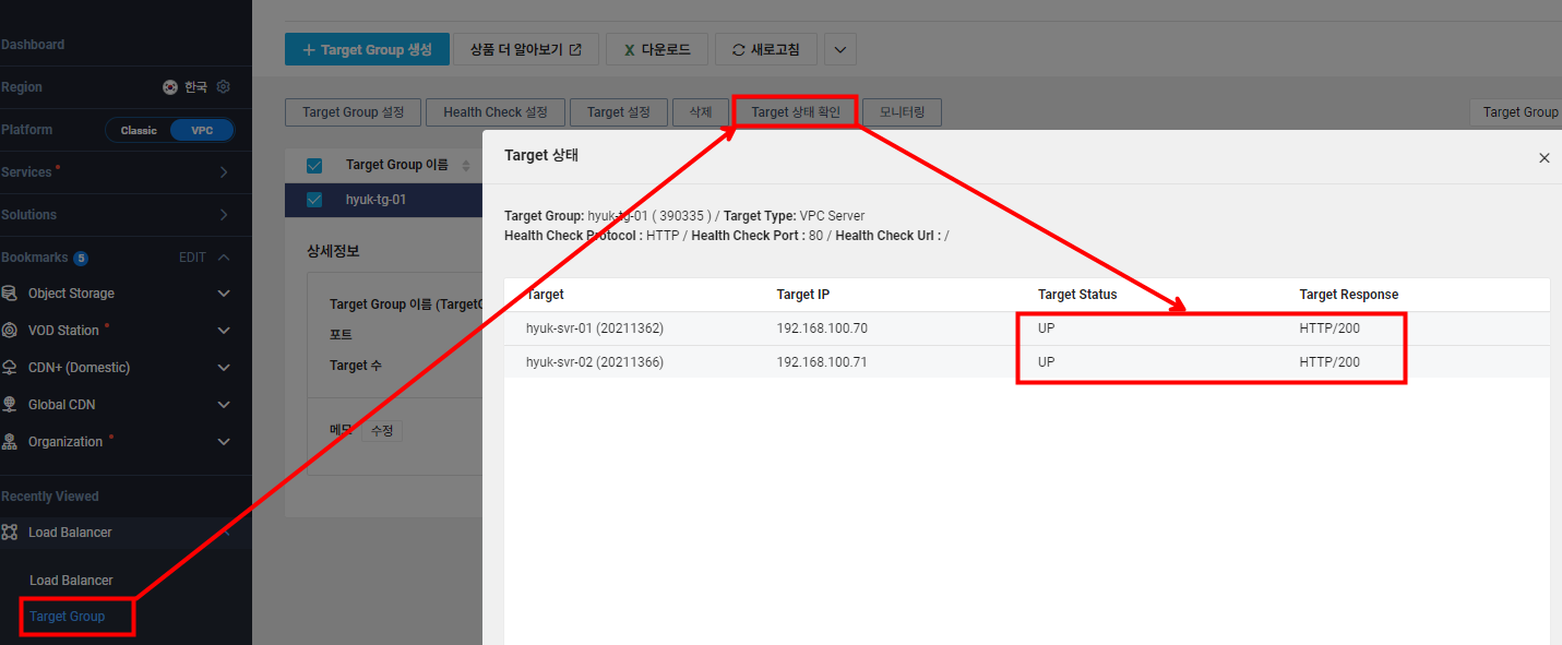 Health Check 시간을 30초로 두고 정상 임계값을 2로 설정했다면 약 1분 뒤에 상태가 UP으로 바뀔 것입니다.