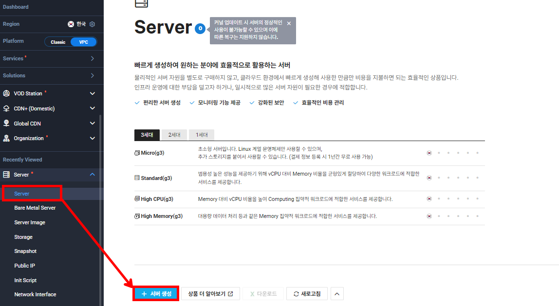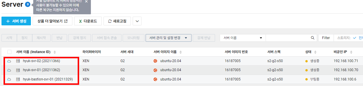 로드 밸런서 테스트를 위해 Bastion 서버를 1개, Private 서버를 2개 생성합니다. Private 서버는 두 번 설정하기 힘들 수 있기 때문에 [내 서버 이미지]를 생성한 후 복제해도 괜찮습니다. 아니면 서버를 생성할 때 패키지를 [Init Script]를 적용하여 생성해도 괜찮습니다.
