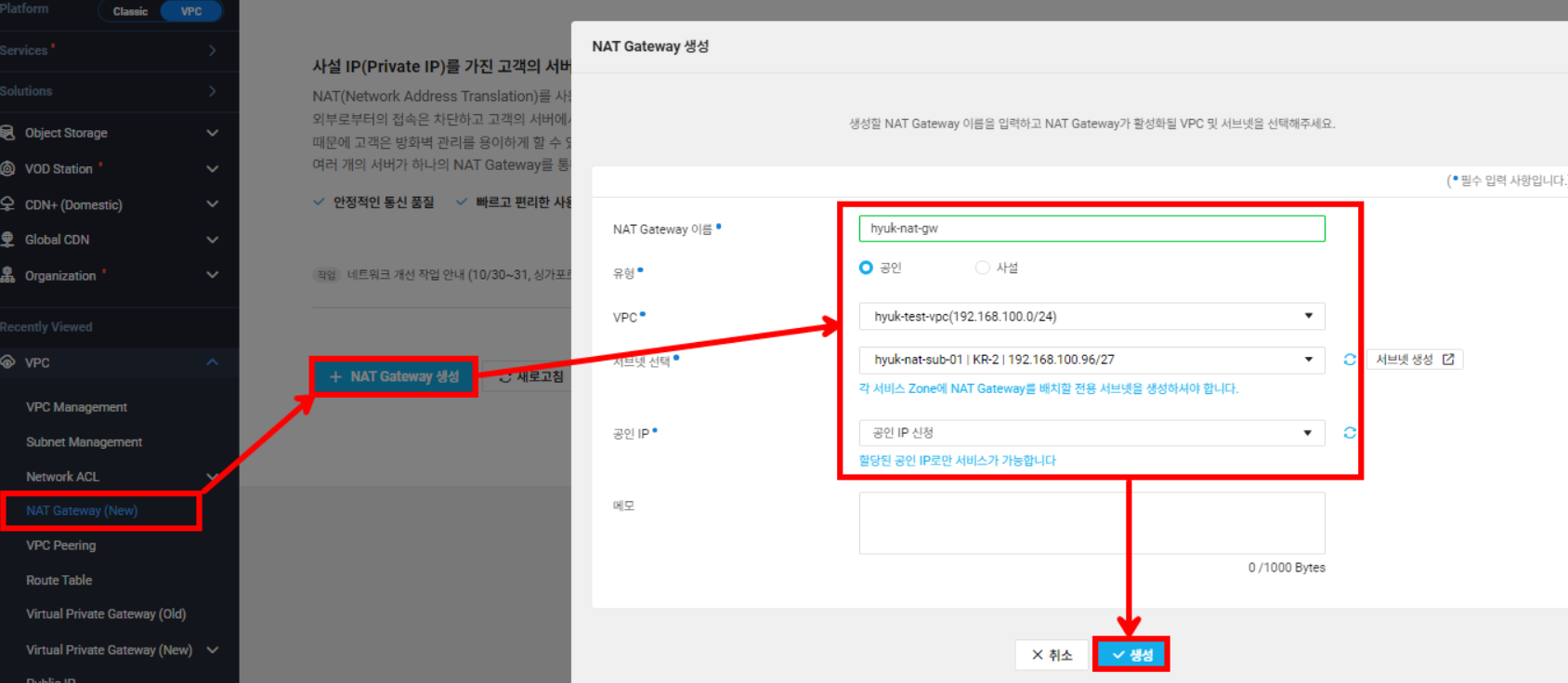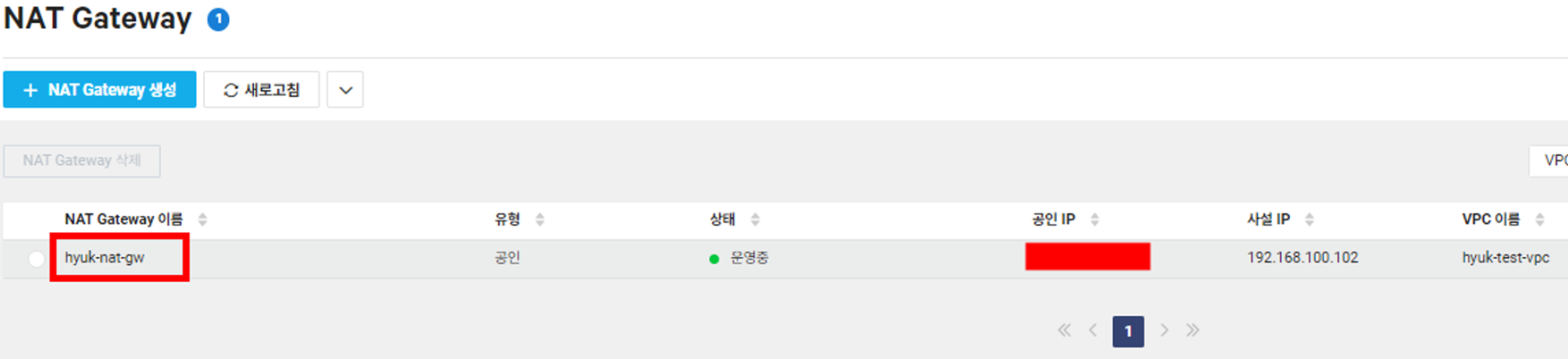 | hyuk-nat-sub-01 | 192.168.100.96/27 | Public | NAT 게이트웨이 |