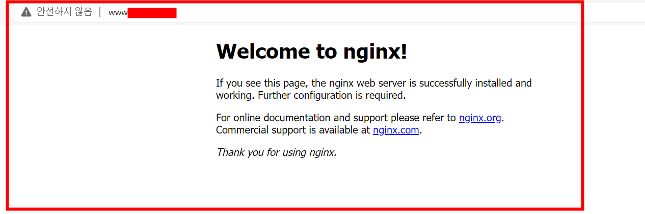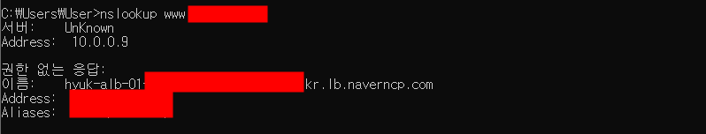 도메인에 접속하면 다음과 같이 Global DNS의 CNAME 레코드에 애플리케이션 로드밸런서 엔드포인트를 등록하여 다음과 같이 도메인을 통해 접속 가능한 것을 확인할 수 있습니다. nslookup으로도 확인할 수 있습니다.