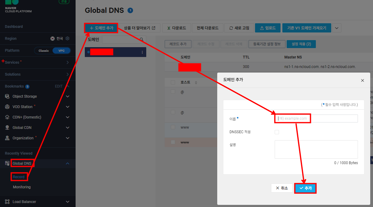 가비아에서 구매한 도메인을 NCP Global DNS에 도메인 추가 버튼을 이용하여 추가합니다.