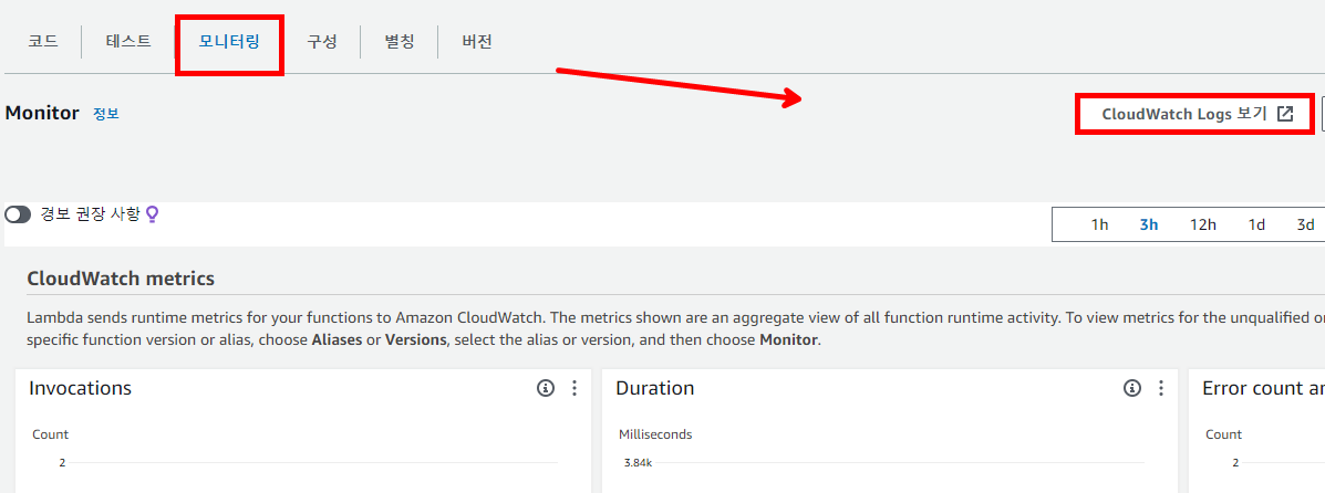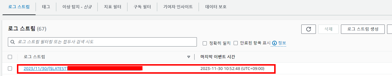 Lambda 모니터링 탭에서 CloudWatch Logs 보기를 통해 로그를 바로 확인 가능한데 이벤트를 발생시킨 후 새로고침하여 가장 상단에 위치한 최신 로그를 확인해 보면 이벤트가 정상적으로 JSON 형태로 찍히는 것을 확인할 수 있습니다.