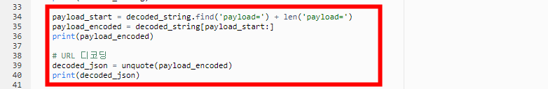 불필요한 문자열인 payload= 를 먼저 지워준 후 URL 디코딩을 통해 특수 문자를 인지 가능한 형태로 디코딩합니다. urllib 역시 파이썬 내장 라이브러리이기 때문에 따로 추가해 줄 필요 없습니다. 로그를 보시면 딱 필요한 형태로 바뀐 것을 확인할 수 있습니다.