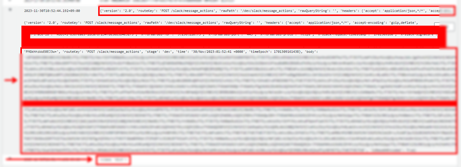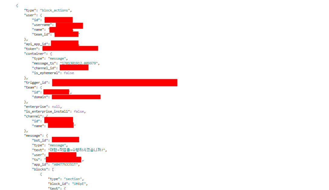 Flask에서는 request.form.get("payload")로 바로 JSON 형태로 추출이 가능했지만 Lambda에 Flask를 올릴 것은 아니기 때문에 Payload를 로그 찍어보며 어떻게 JSON 형태로 변환하면 좋을지 고민해 보다가 이런 방법도 있는 것 같아서 소개해드리려고 합니다.