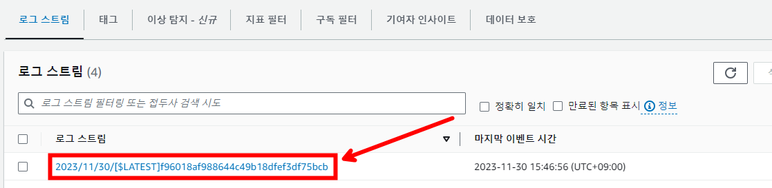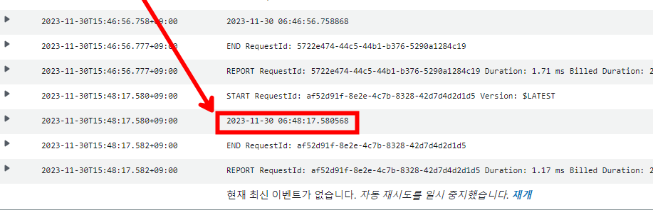 다음과 같이 CloudWatch Logs를 확인하여 실제로 라이브러리가 적용되었는지 확인해볼 수 있습니다. 현재 시간은 15시 46분이지만 Lambda에서는 기본적으로 표준시를 따르고 있기 때문에 한국 시간으로 바꿔주기 위해서는 datetime의 지역을 지정해주어야 합니다.