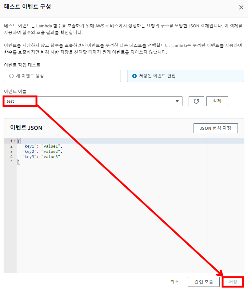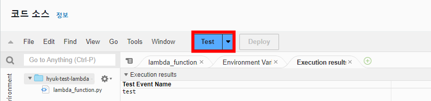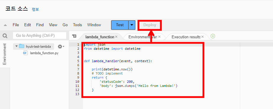 다음과 같이 datetime 라이브러리를 호출한 후 Deploy를 눌러 배포합니다. 그 후 Test 케이스를 생성한 후 Test 버튼을 누르면 Lambda 함수 안에서 자체적으로 테스트해 볼 수 있습니다.