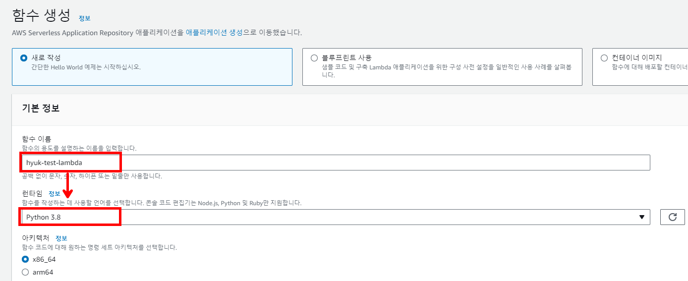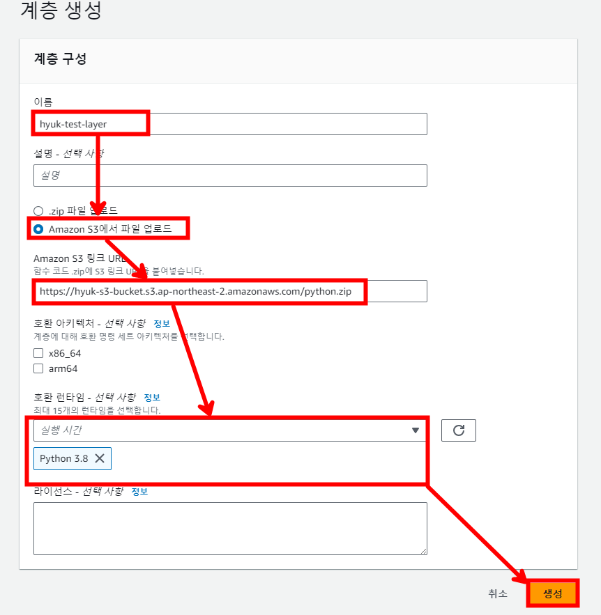 다음과 같이 Layer를 생성할 때 S3에서 파일 업로드를 선택하고 런타임 또한 지정하여 생성합니다.