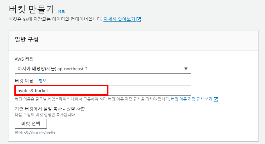 AWS CLI에 configure로 등록한 계정에서 S3를 생성합니다. 다음과 같이 다른 설정 없이 S3 버킷 이름만 지정한 후 생성해 줍니다.