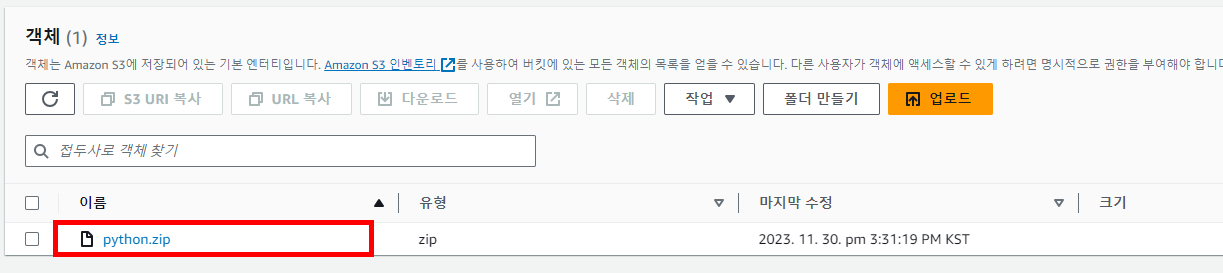 다음과 같이 S3로 python.zip 파일이 업로드 된 것을 확인할 수 있습니다.