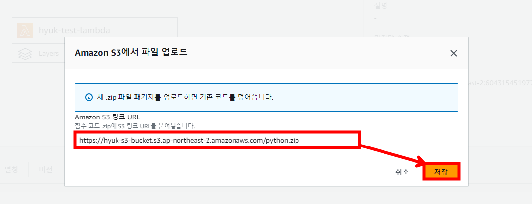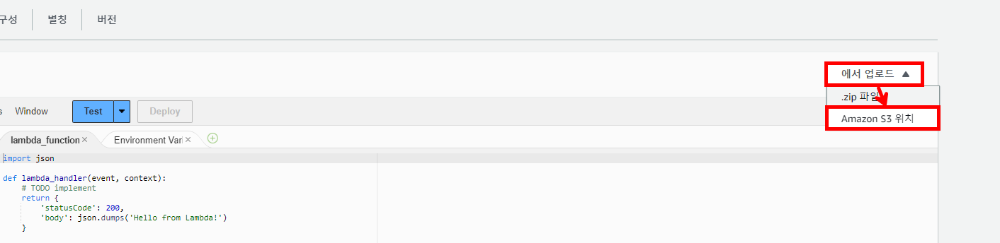 다음과 같이 Lambda 함수 우측 상단에 있는 업로드 버튼을 통해 S3 위치에 있는 라이브러리를 직접 업로드할 수 있습니다.