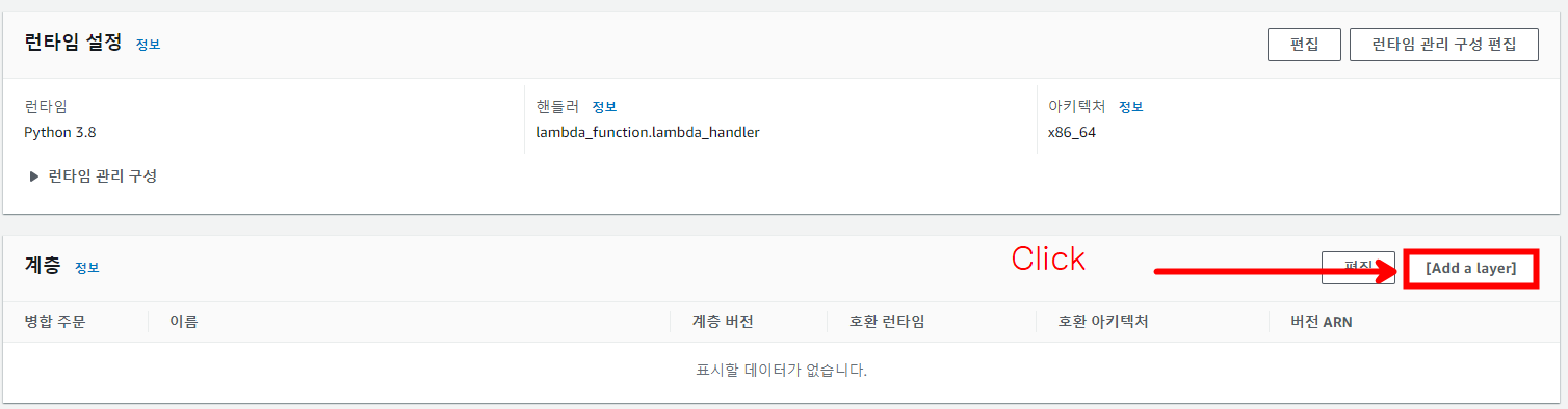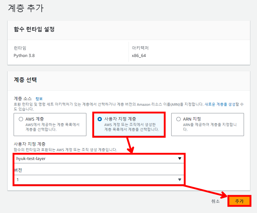 다음과 같이 생성한 계층을 Lambda에 적용할 수 있습니다. 계층(Layer)는 직접 업로드하는 방식과 다르게 생성하면 비용이 부과되기 때문에 테스트로 생성하셨다면 꼭 리소스를 지워주시기 바랍니다.