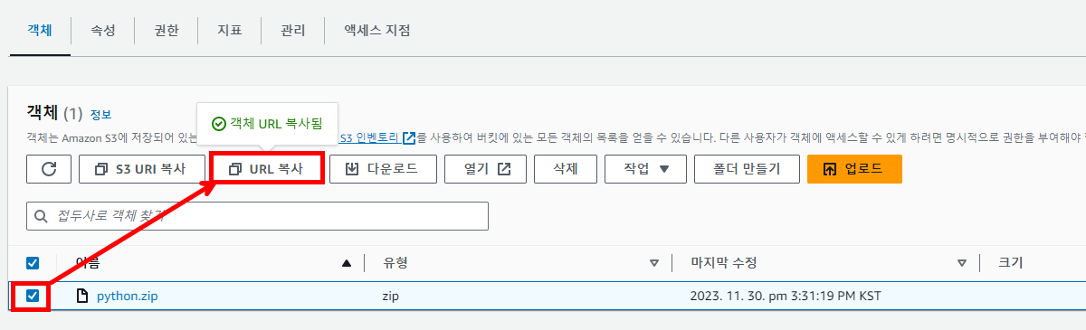Lambda에 python.zip 파일을 적용하기 위해 체크한 후 URL 복사를 선택합니다.