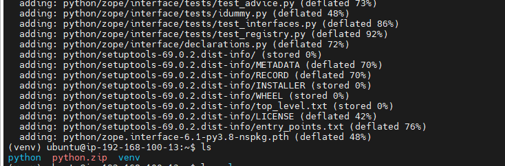필요한 라이브러리를 설치해 줍니다. Lambda에서는 라이브러리에 용량 제한이 걸려 있기 때문에 설치하는 라이브러리가 많다면 dist 등 필요 없는 파일은 삭제해 주어도 괜찮습니다. 라이브러리 설치 후 홈으로 돌아가서 python 디렉터리를 zip으로 압축합니다.