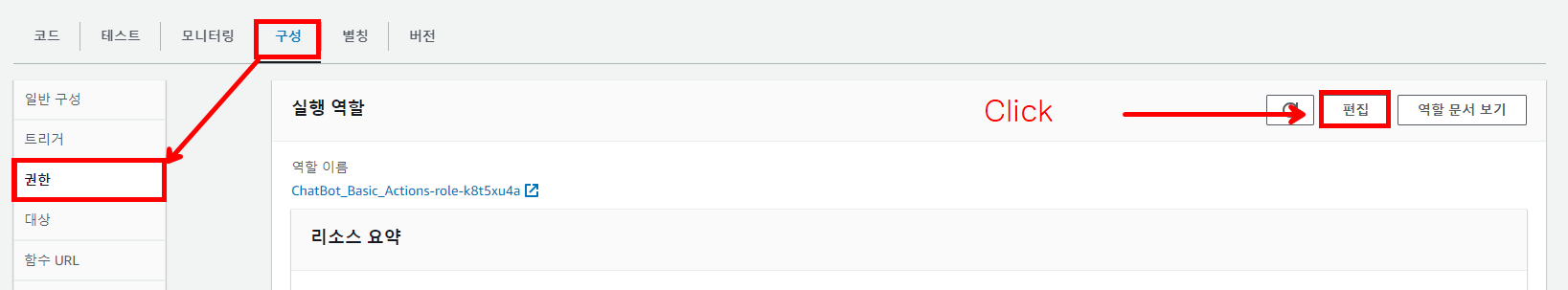 현재 서비스 로직이 들어가 있는 Lambda 함수에서 구성탭에 있는 권한을 보시면 Lambda-role이 있습니다. 기본적으로 Lambda-role에는 CloudWatch Logs 권한 밖에 들어가 있지 않기 때문에 Secrets Manager를 read/write 할 수 없습니다. 해당 역할로 들어가서 권한을 추가해야 합니다.