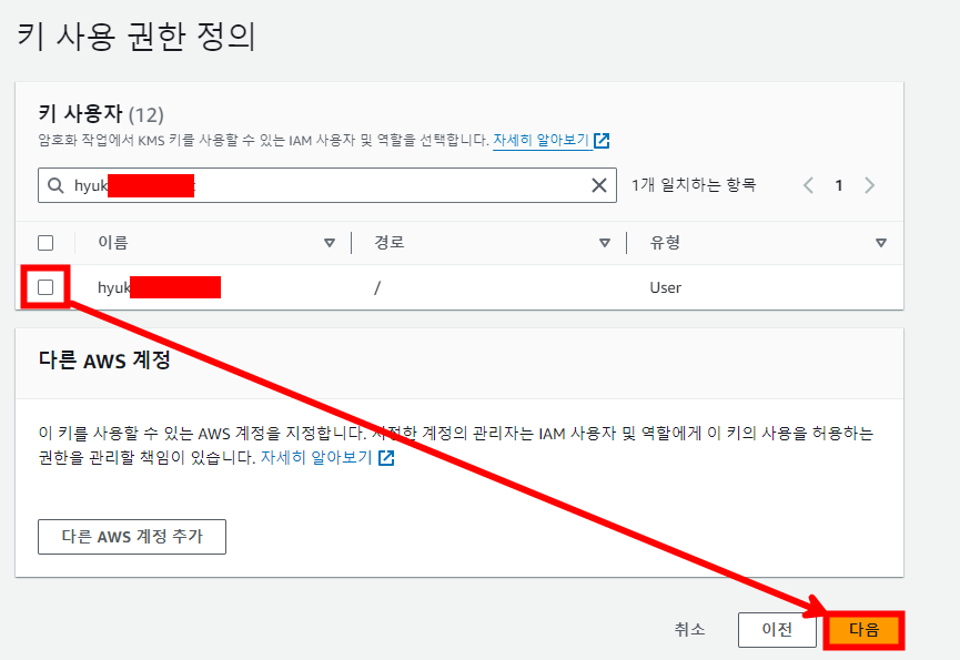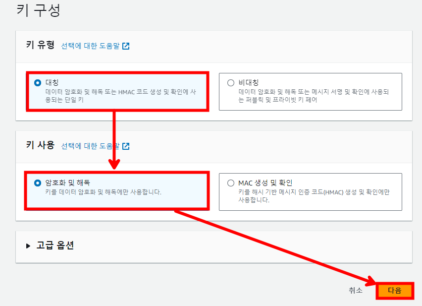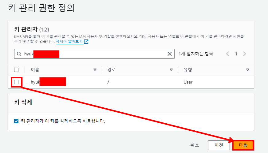 다음과 같이 AWS KMS를 이용해서 고객 관리형 키를 생성합니다. 키 유형은 사용성을 위해 대칭 키로 선택했고 키 관리, 사용자에 저를 추가한 후 생성하였습니다. 키는 생성하면 삭제할 때 키 관리자가 할 수 있으며 즉시 삭제되지는 않습니다.