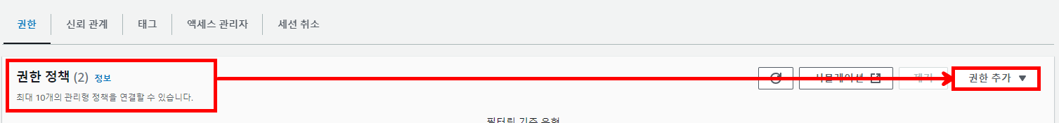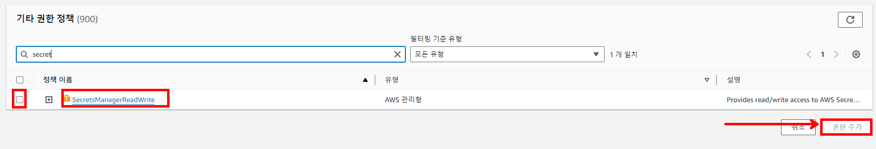 다음과 같이 해당 역할에서 SecretsManagerReadWrite 권한을 추가한 후 저장합니다.