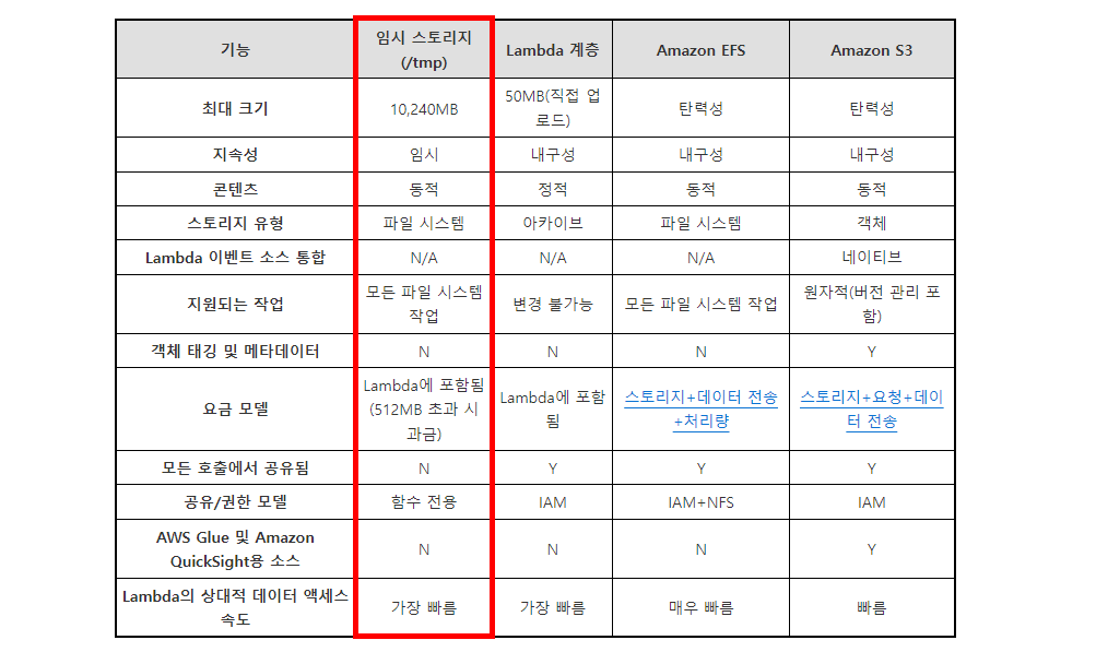 Lamabda에서는 2022년부터 임시 스토리지를 제공하고 있습니다. 이 임시 스토리지는 다음과 같은 특성을 가지고 있습니다.