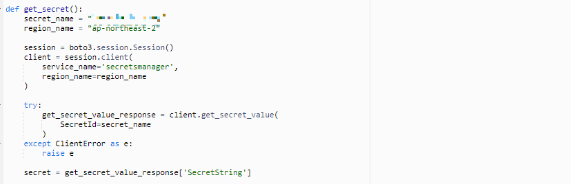 그러면 다음과 같이 제공받은 Secrets Manager 코드를 사용할 수 있습니다. Secrets Manager 가장 마지막에 언어별로 호출할 수 있는 코드를 제공받았습니다. 저는 함수의 런타임을 Python으로 생성하였기 때문에 파이썬 코드를 사용하여 값을 반환받으려고 합니다. json.loads를 이용하여 현재 문자열 형태로 반환된 값을 json 형태로 변환합니다.