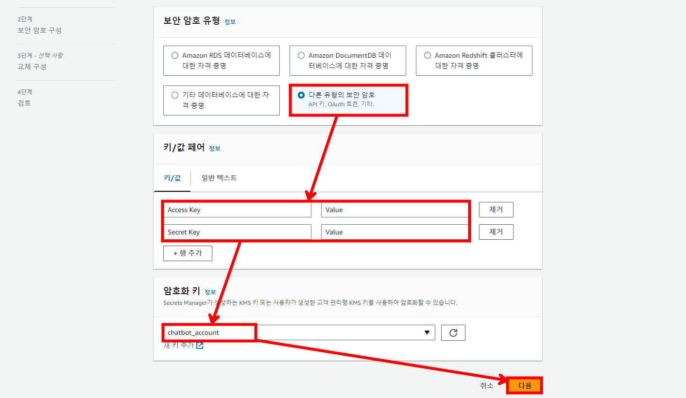 다음과 같이 Secrets Manager를 선택한 후 API 키가 포함된 다른 유형의 보안 암호를 선택해 줍니다. 키/값 페어값이 Key-Value 형태로 되어 있기 때문에 행 추가를 해준 후 API 키에서 Access Key/Secret Key를 적어줍니다. 암호화 키는 앞서 생성한 KMS의 대칭 키를 넣어줍니다. 보안 암호 이름은 식별하기 위한 이름이기 때문에 생성해 주면 다음과 같이 Key, Value 값을 호출할 수 있는 코드를 제공합니다.