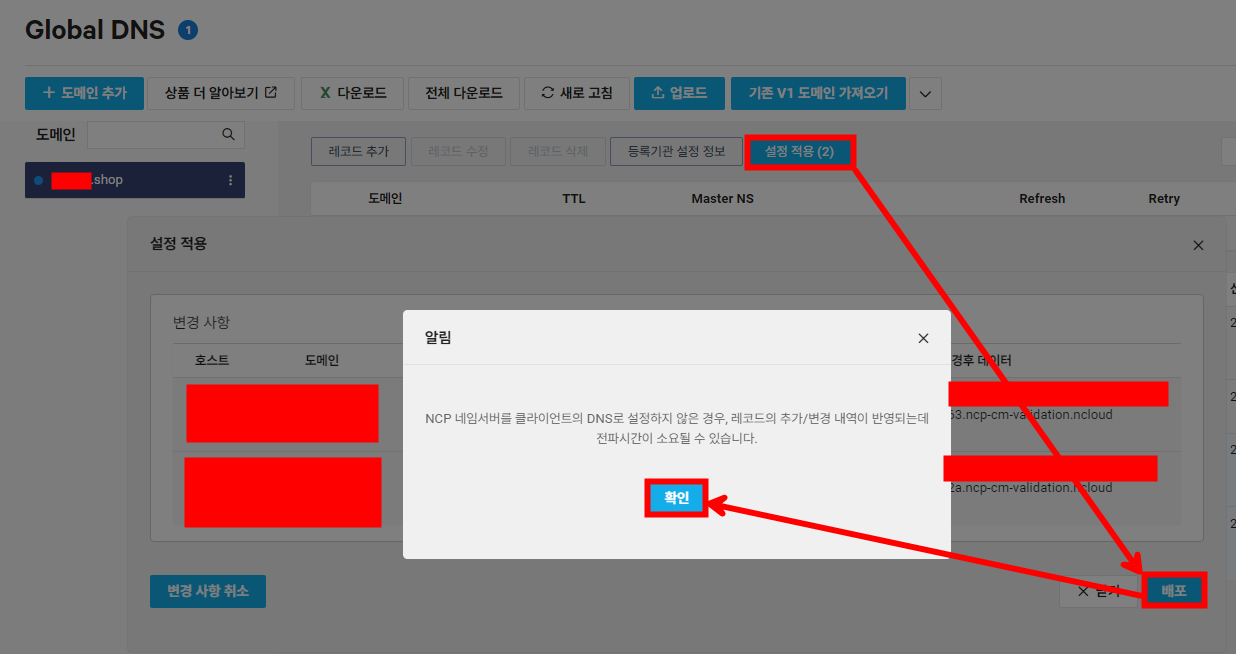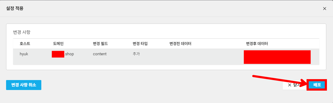 위와 같이 레코드를 추가한 후 [설정 적용]을 통해 도메인을 배포합니다.